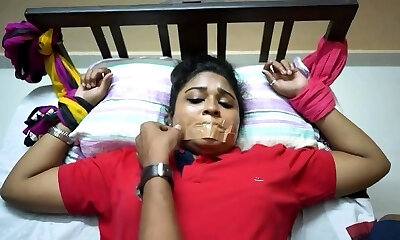 Cable restrain bondage binds her tits while she gets fucked by two guys