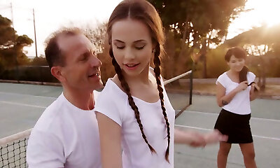 Horny trainer fucks couple of sexy slim girlies after super-cute tennis game